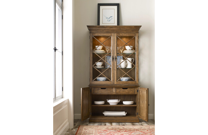 The Mortimer Cabinet is the just-right-sized vertical piece for today's open living and dining spaces giving the home the functional features of a china cabinet without requiring a large wall. The deck includes curio style tempered glass end panels on the deck portion, two adjustable tempered glass shelves, and recessed touch operated lighting. In the base there are two full depth drawers and one adjustable wood shelf. Built as a separate base and deck, the cabinet can be used as a base only as the base has a finished top.