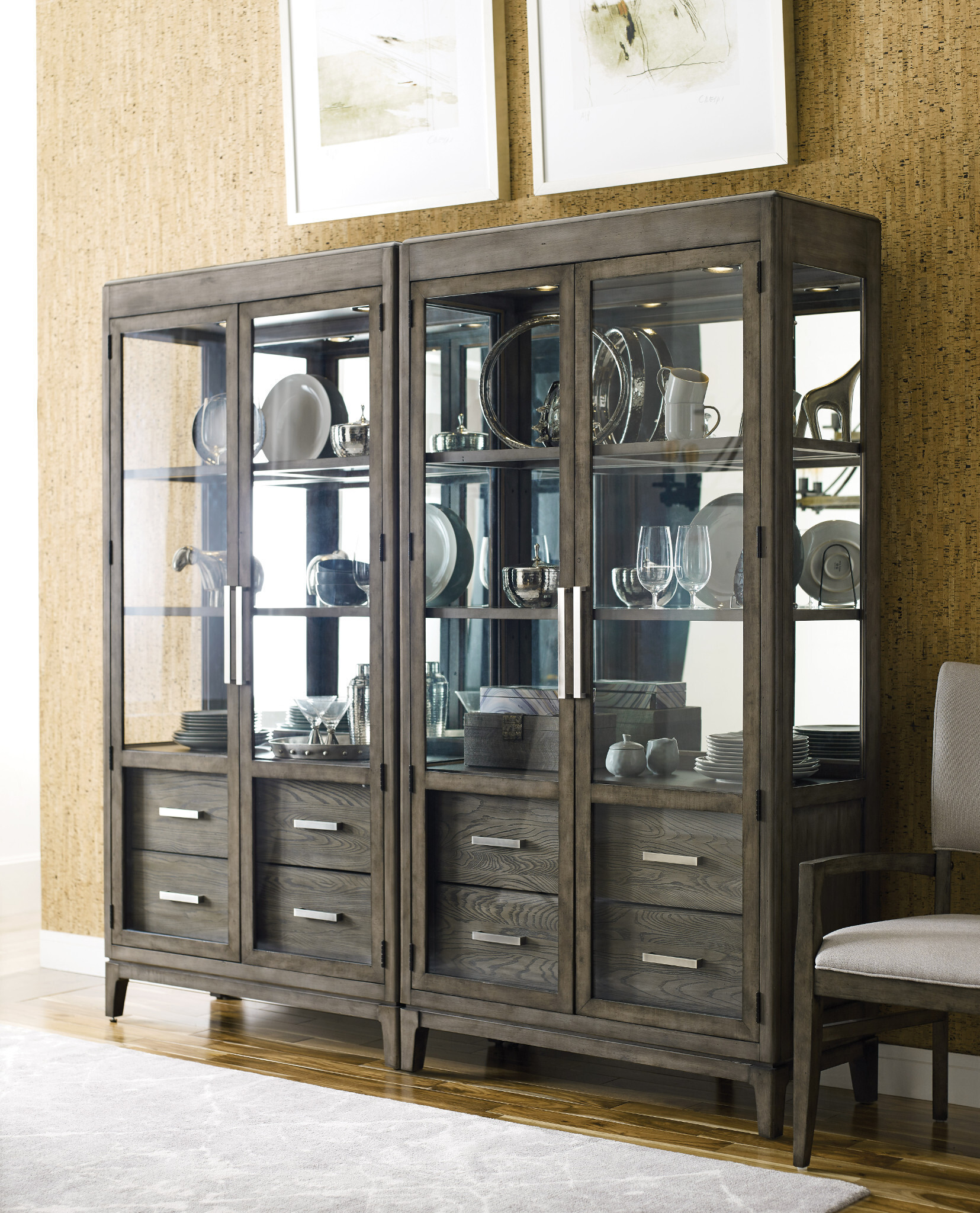 - Two drawers, two doors, two adjustable wood framed glass shelves with plate grooves, one fixed wood shelf, two can lights.