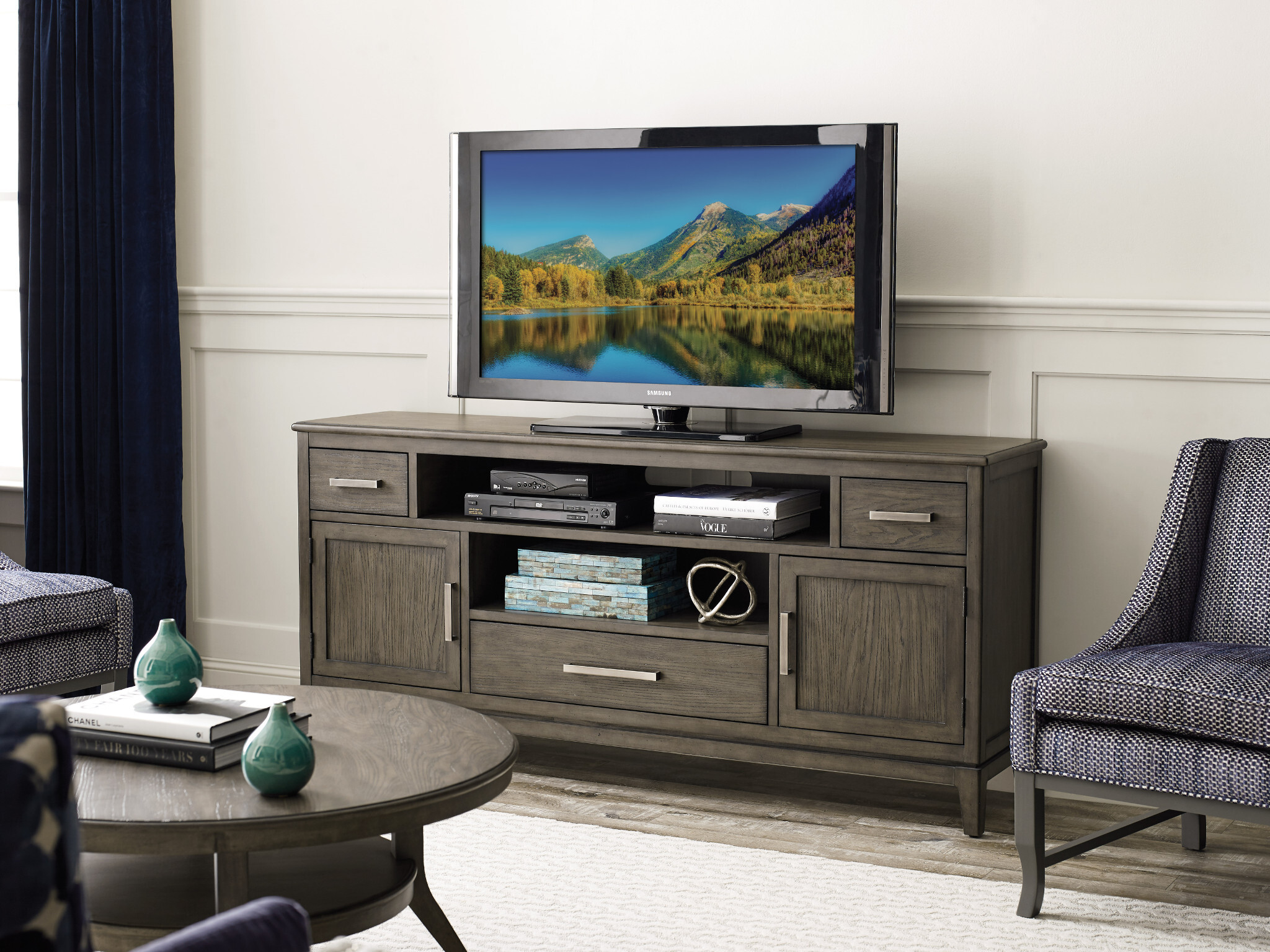 - Three drawers, two doors, two open compartments, adjustable shelf behind each door, electrical outlet inside top compartment, cord exits & vent slots.