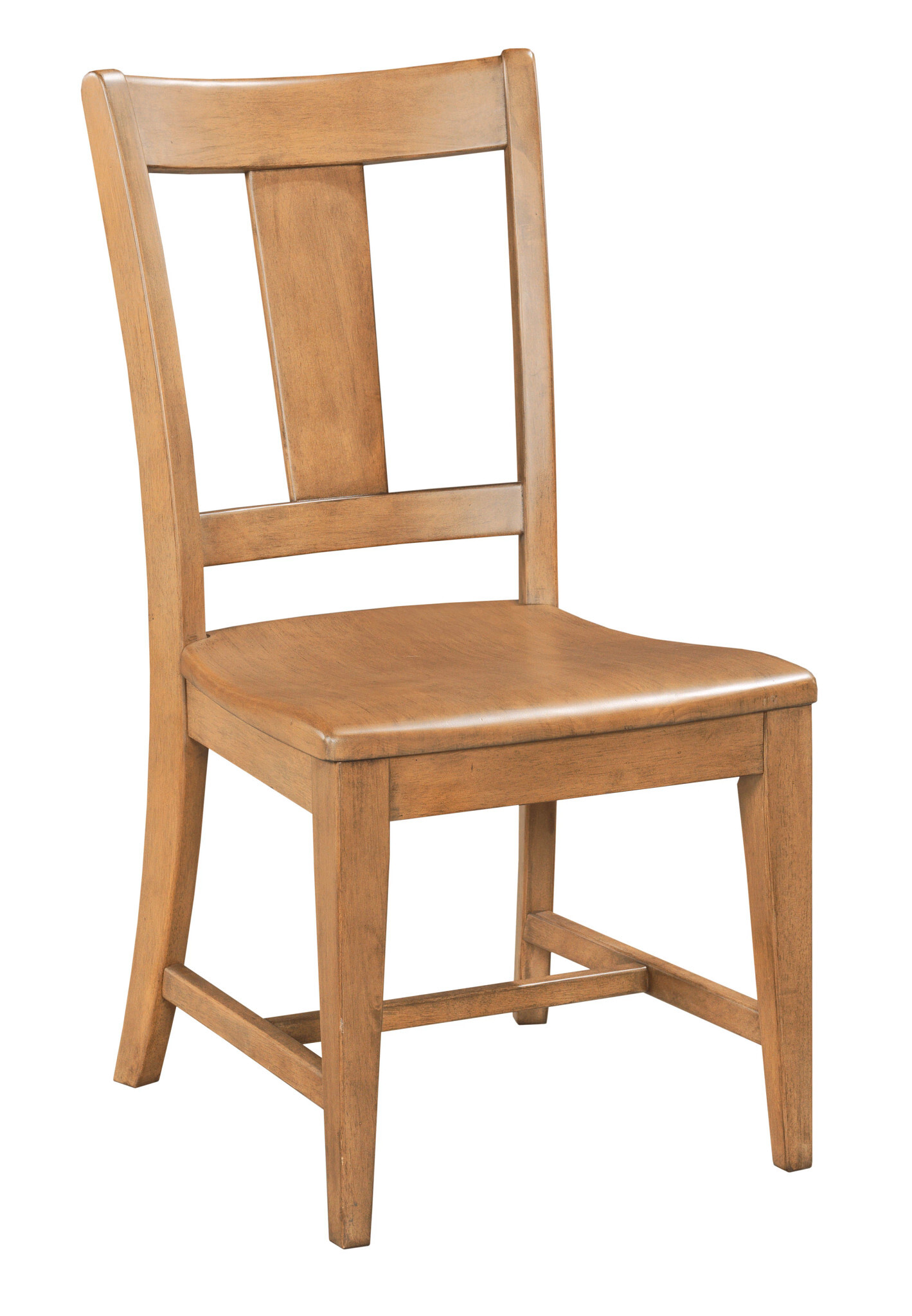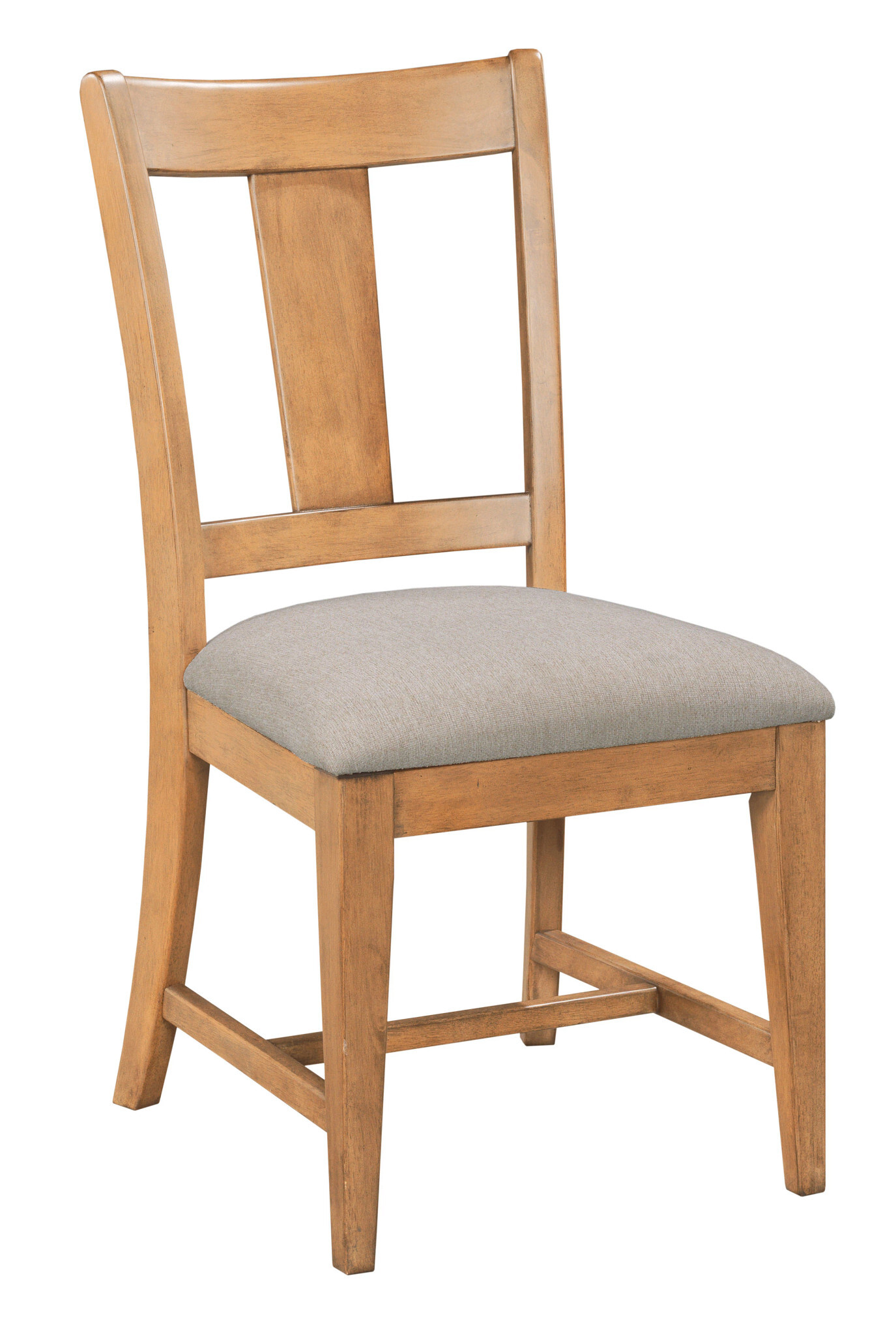 The more transitionally styled chair in the Kafe Casual Dining Collection is the Splat Back Dining Chair. With a somewhat minimalist design, the Splat Back chair features a clean, tapered splat in the silhouette of the back. Like the other chairs in the Kafe program, this one is also available in either the Latte finish (shown here) or the darker Mocha option. Adding to this choice is the option of using either an upholstered seat or wood seat (both are included at no extra charge). Many customers enjoy the comfort of a fabric dining seat so we used a performance fabric made to repeal stains and withstand years of everyday use. Others may prefer the wood seat option for its more casual look, and the quick cleaning and worry free nature of a solid wood seat.